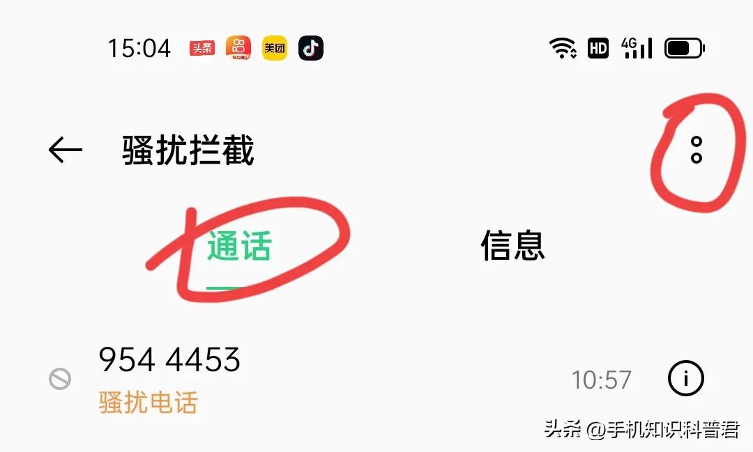 点通话记录右上角的两小点,再选择骚扰拦截(如上图所示)