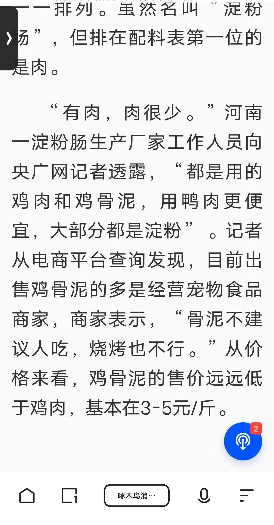 但是在下一页记者将一位淀粉肠生产厂家的工作人员说的话记录了下来,这位工作人员向记者透露:用的都是鸡肉和鸡骨泥,用鸭肉更便宜,大多数都是淀粉"。