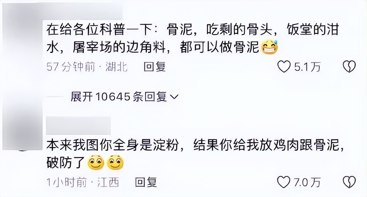 一些在"淀粉肠塌房"的视频下不免看到很多号称知情人士在下面科普,使得很多网友闻淀粉肠色变,比如一些说骨泥其实就吃剩的骨头,食堂的泔水,或者是屠宰场的边角料做成的。