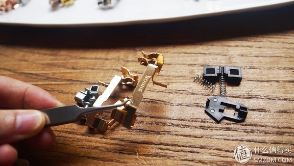 完全拆解出来可以看到,螺丝部分是采用的合金金属,载流件都是铜的,载流件和拨嘴,弹簧和翘板上都是满满的润滑油。