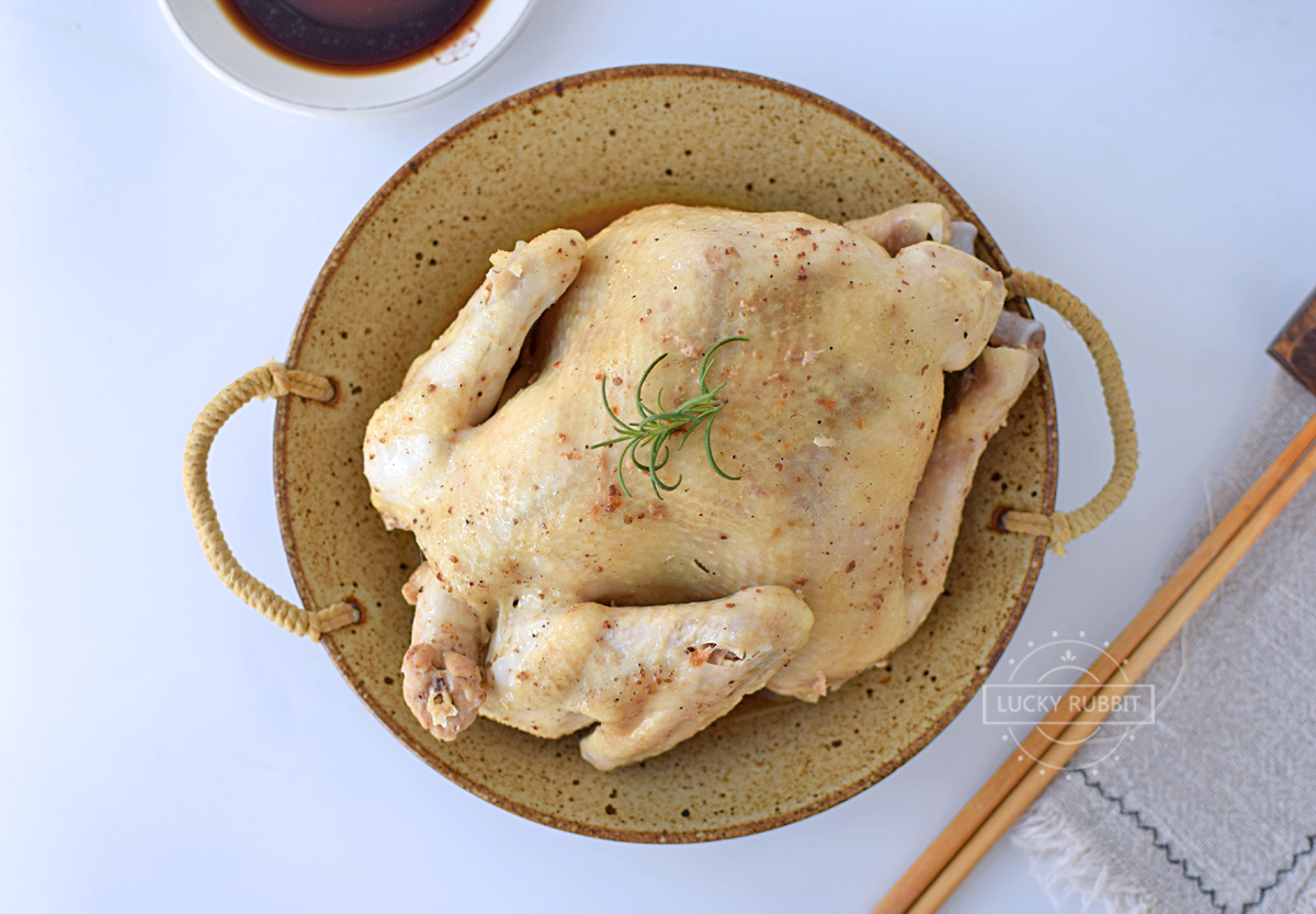 三黄鸡 / 食用盐 / 白胡椒粉 / 花椒粉 / 生姜 / 香葱 / 黄酒 / 迷迭香