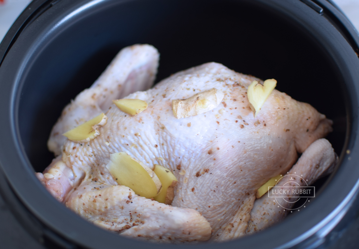 6、切一点姜片放在鸡肚子里,鸡身体上也要放几片。