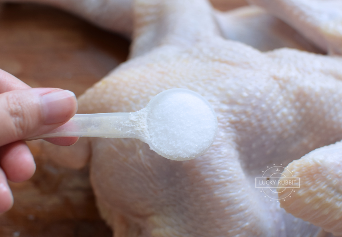 3、接下来再抹一些白胡椒粉,白胡椒粉不要加太多,稍微抹一点就可以了,否则味道太浓会改过鸡肉本身的香味。