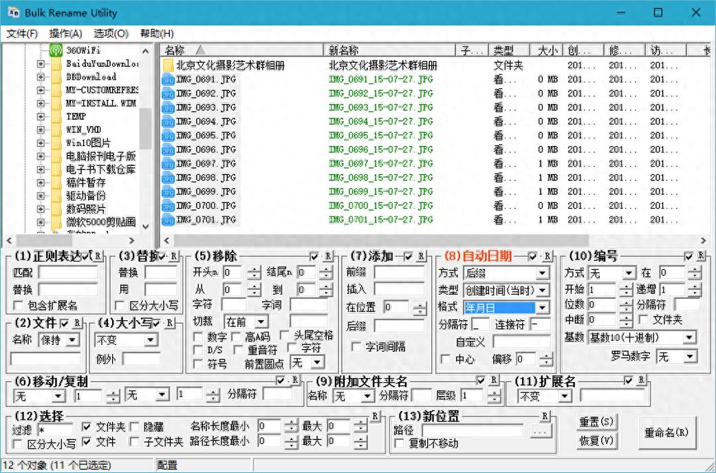 假设照片文件夹名为“颐和园旅行”,照片名为形如“IMG_0629.JPG”的格式,希望命名后为“颐和园旅行-IMG_0629.JPG”。可以用Bulk Rename Utility软件,选中“附加文件夹名”,名称选择“前缀”,加上分隔符“-”,根据需要选择文件夹层级。最后在预览合格后,执行“重命名”按钮即可。