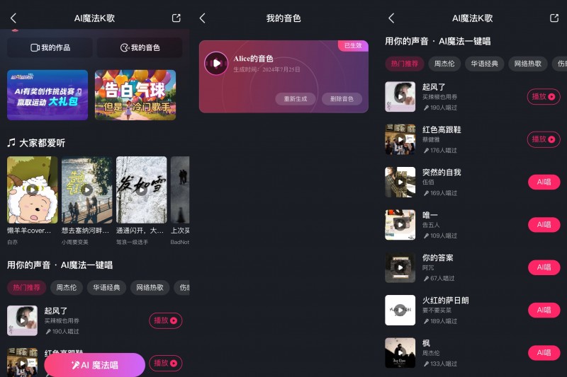 前有徐佳莹在节目中翻唱周杰伦的经典歌曲《最长的电影》,重新演绎周董“放不下的耿耿于怀”,用特有的音色唱出“静静的怀念”;后有周杰伦亲临节目现场,与“音乐顽童”庾澄庆改编《星晴+情非得已》,两种音色结合赋予这首歌新的魅力,咪咕音乐表示:音乐玩法Get!“AI魔法K歌”便是这样一款让你用自己的音色一键翻唱的“翻唱神器”——只需朗读一段文本训练本人音色,完成后便可以对热门经典歌曲进行一键AI翻唱。与传统的K歌不同,本人音色一旦训练生成,便能百搭曲库所有曲目,实现一键唱,从《起风了》到《突然的自我》,从《Mojito》到《东风破》,用你的音色玩转各种曲风,每个人都能成为“K歌之王”。将翻唱短视频设置为视频彩铃,来电的对方都得夸上一句:哎哟,唱得不错哟!