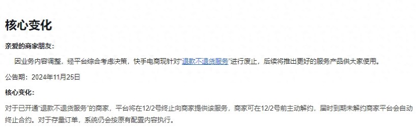 近日,快手电商更新了一则“关于废止‘快手小店退款不退货服务规则’服务说明”的公告,公告中称:将针对“退款不退货服务”进行废止,后续将推出更好的服务产品供大家使用。公告还称,对于已开通“退款不退货服务”的商家,平台将在12月2日终止提供该服务,商家可在12月2日前主动解约,到期未解约商家,平台会自动终止合约。对于存量订单,系统仍会按原有配置内容执行。