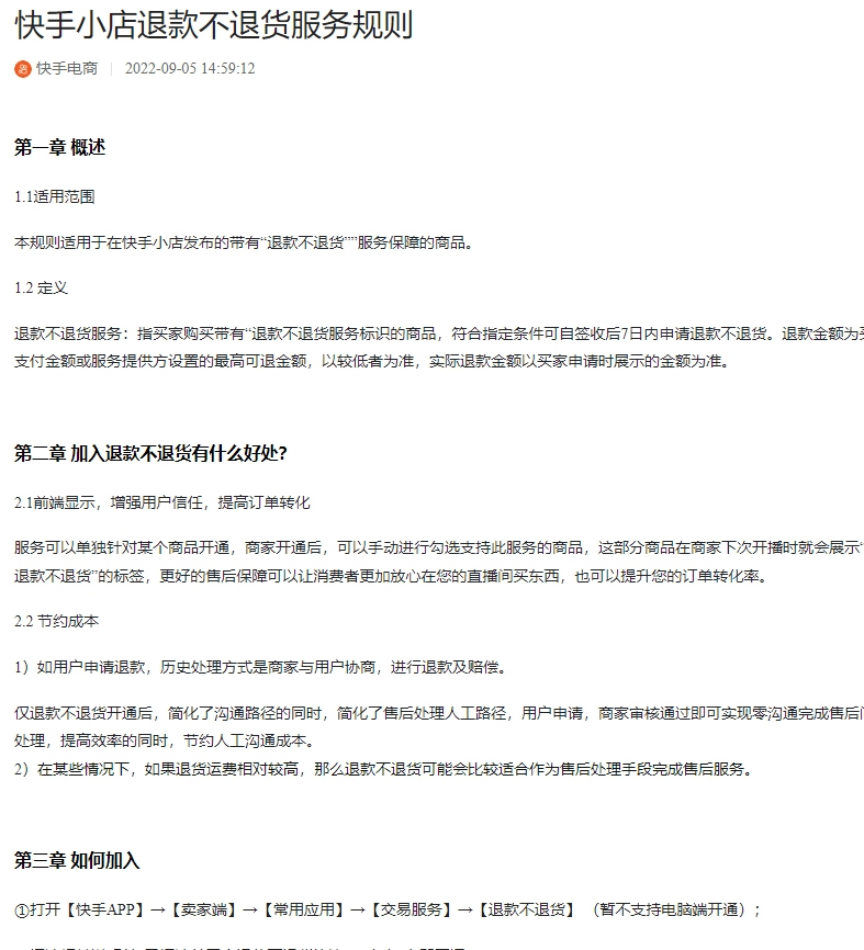 被“废除”的快手旧版的退款不退货服务规则 图片来源:快手电商规则中心
