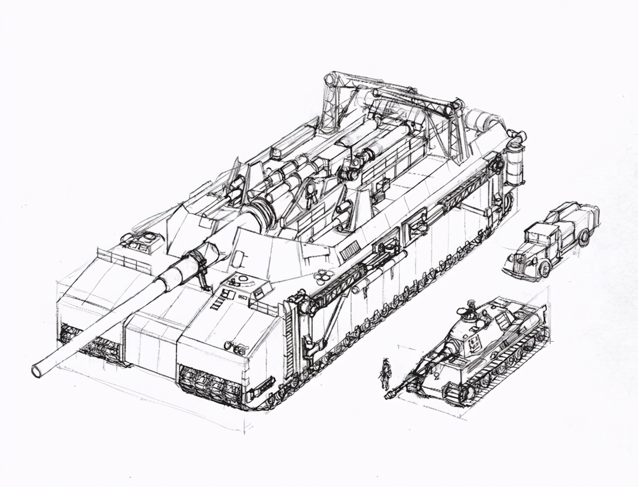 ▲虽然看起来十分威武,但无论是鼠式的弧形炮塔,还是128mm kwk,都是在P.1000项目被叫停的半年后才陆续出现的,上图掺杂了不少后人的想象