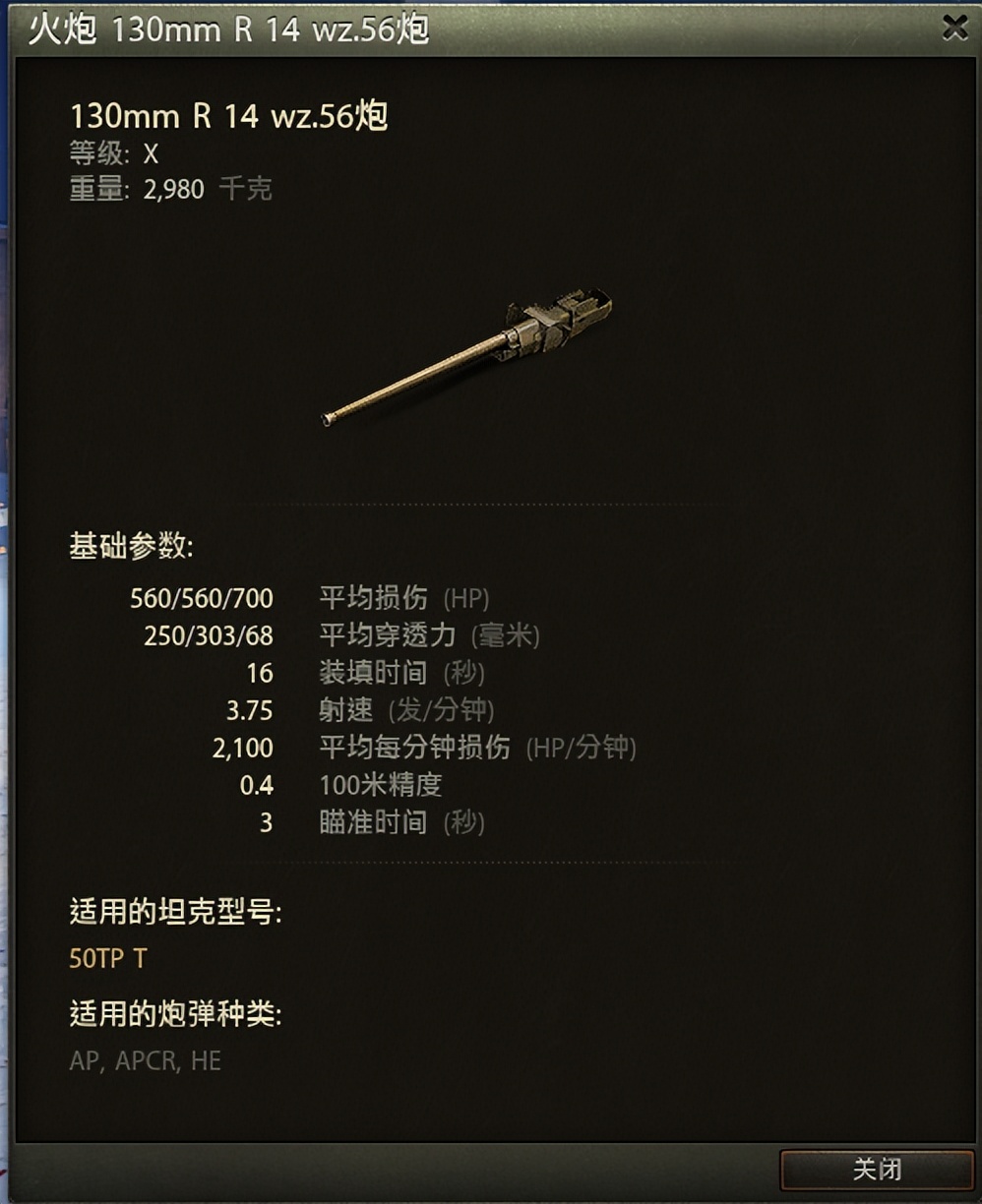 50TP使用的是一门130mm火炮。主力炮弹的单发伤害为560点。银币弹穿深为250mm,金币弹穿深为303mm。银币弹弹速为900m/s,金币弹弹速为1125m/s。基础百米精度0.4,基础瞄准时间为3秒。