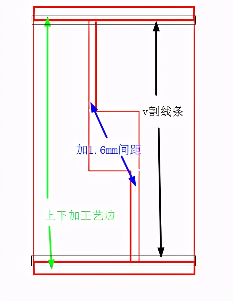 首先v-cut需要板子卡入机器的轨道,两边不平整的,板子在传入机器的过程中会移动,v-cut会切偏;v-cut不能切割到一半就停止,也不能切割到一半就跳转到另外一边切割。其实左边的图进行一下调整修改就可以很好v-cut。L形状的2个板接触的部分加宽间距1.6mm(常规锣边锣刀1.6mm、2.0mm或者是大于2.0mm方便加工,锣边效率快),上下方向各加一条工艺边。这样也节省面积,同时也能v-cut。