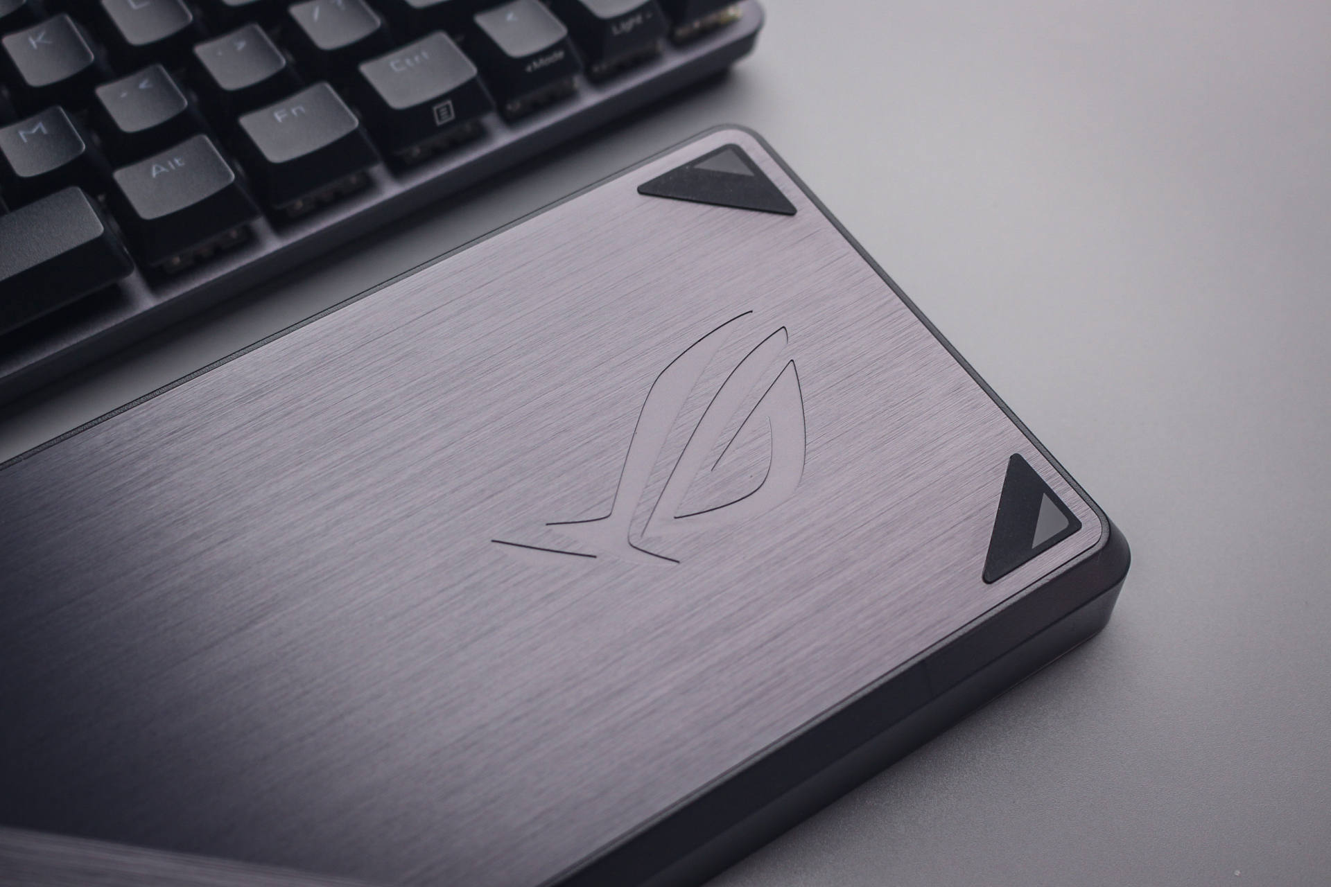 抽去产品的外包装ROG明显的logo显现出来,不需要太多语言告诉你它的身份。从包装上就能感受到ROG的用心,减震海绵、织物包裹让这把键盘保存完好。