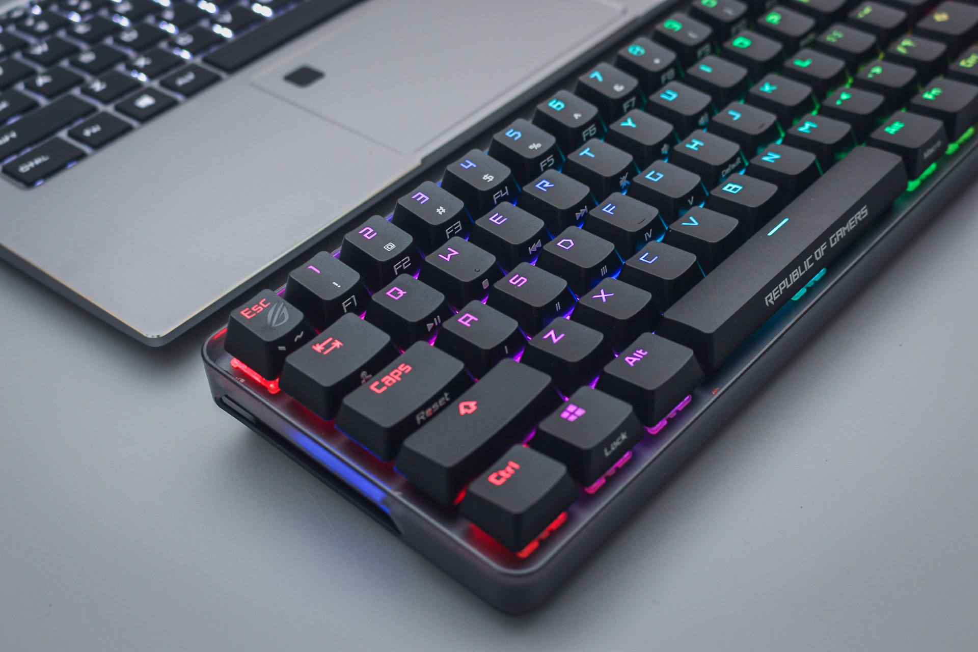 当这把键盘与电脑连接打开灯光你才会感受到它的更好看的一面,在RGB的映衬下键盘确实很漂亮,不过遗憾的是Esc键上的ROG的logo并不能亮光略显遗憾。