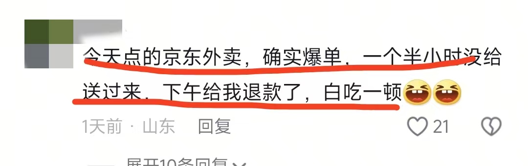 更有一部分人调侃的表示,自己小区这会只让京东外卖骑车进去送,其他平台的得自己走进去。