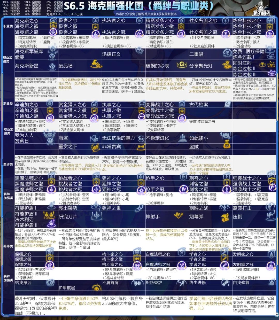 大家好!我是兔子,一篇确实讲不完S6.5,海克斯可以说是S6的神级改动,让这个游戏充满了多变,每个赛季都不一样,S1是完全固定的装备+阵容,S2加入了地形格和元素,变成装备+阵容+地形+元素小幅变化,S3是装备+阵容+星球,S4是装备+阵容+天选,S5是装备+黑暗/光明+阵容,S6是装备+海克斯+阵容,要说变化,S6几乎达到了极致。