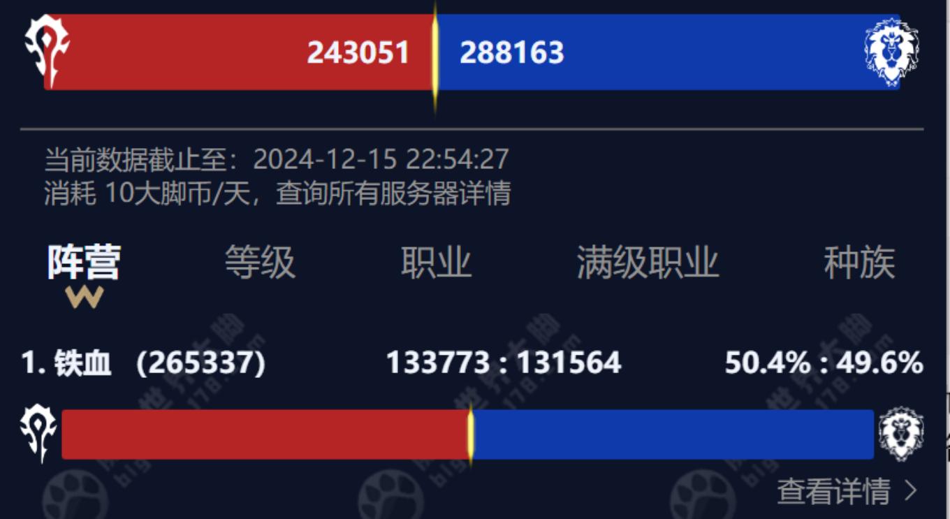 以12月15日的数据为例,大家会发现一件事情,此时的魔兽世界经典怀旧服的24小时活跃人数就已经来到了52万的水平,对比于刚刚开服的时候确实少了一些,并且硬核服中还会出现重复计算的可能性,一开始农工觉得这个数值应该会维持挺长一段时间,但是今天去的时候却感觉到很震惊,目前经典怀旧服的人数已经不是52万了。