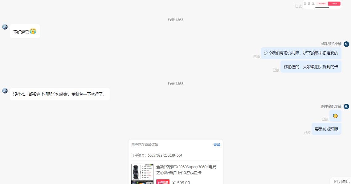 其实这个事情对于这个客户来说,换个几十块的机箱就可以,而对于我们则是要多一张拆封的显卡,大家也知道现在的显卡,大家都很敏感的,要是大家收到一个拆封的显卡,第一反应是啥?这卡我只能便宜很多卖,损失绝对不止这几十块吧。