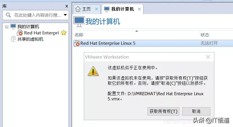 - 问题2:“该虚拟机似乎正在使用中”,请按“获取所有权(T)”按钮获取它的所有权
