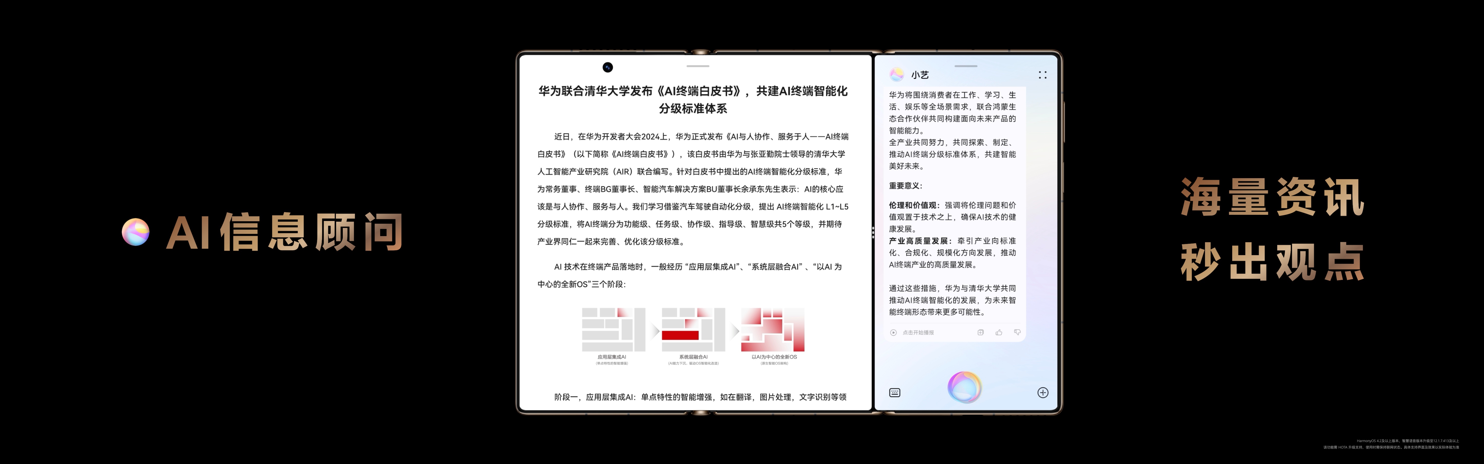 除此之外,华为Mate XT 非凡大师推出了AI信息顾问功能,在浏览资讯类APP时,可以唤醒小艺,出现分屏对话时点击分屏,这时候小艺陪伴在一旁,可以对它说“生成摘要”,或者“总结一下”,AI信息顾问就会提炼文章的核心观点,将长篇文章的精华部分摘要出来,方便阅读。