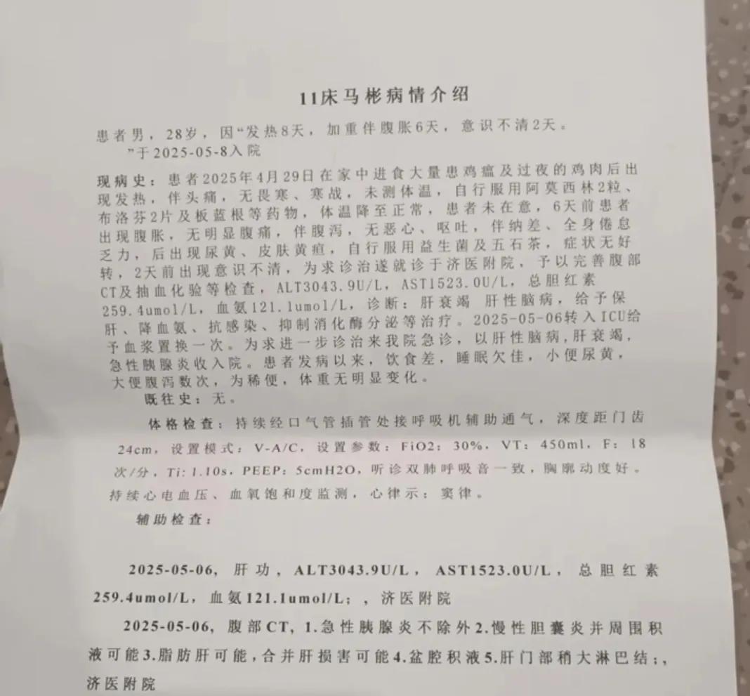 根据马彬病情介绍可以看到,4月29日在家中吃了患鸡瘟和过夜的鸡肉,第二天就出现了发热,他以为是小感冒吃点药就好了,心想又不是大病没有必要去医院,就自己吃了阿莫西林布洛芬等消炎药,你可别说,发热好了体温正常了,也是万万没有想到,几天后身体更加严重了,出现了小便发黄,皮肤黄的症状,还是没有引起马彬的重视,又是自己吃药,结果就昏迷进了医院!