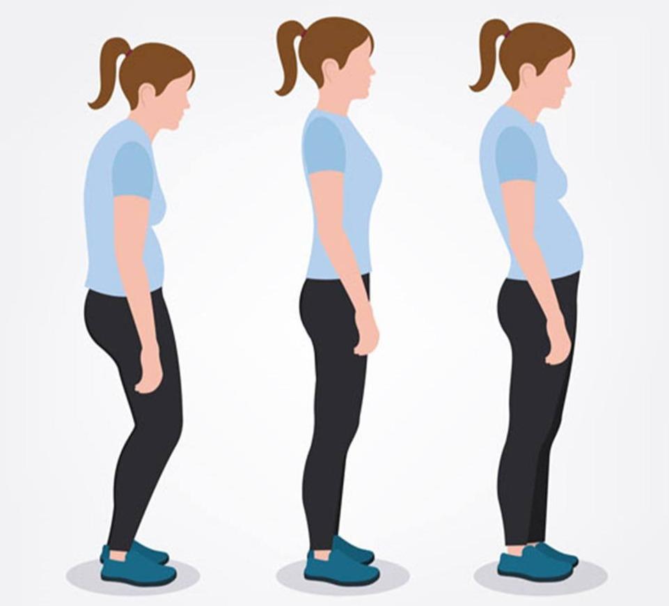 盆骨前倾主要体现在孕妇、有啤酒肚、爱穿高跟鞋的女生中,腰椎受力大,会导致小腹、大腿前侧、小腿后侧3个位置明显突出,整个体态看着不协调,长期养成这种不良习惯会伴随腰疼、假翘臀的现象出现。