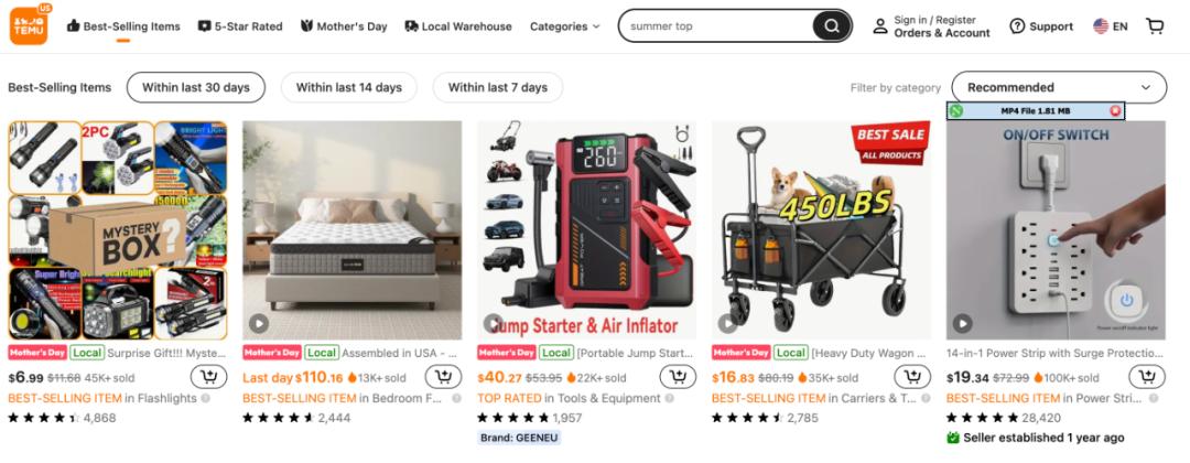 Temu美国站中的本地仓库商品,图/Temu官网