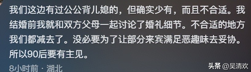 我们这边有过公公背儿媳的,但确实少有,而且不合适。我结婚前我就和双方父母一起讨论了婚礼细节。不合适的地方我们都减去了。没必要为了让部分来宾满足恶趣味去妥协。所以90后要有主见。