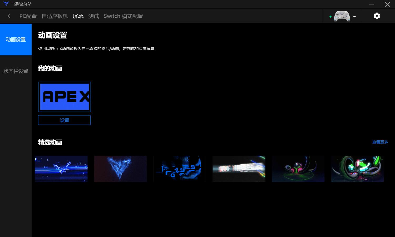 首先就是产品外观,开机之后首先映入眼帘的就是布置在常见Home键位置的智能交互屏,在未打开驱动时,可以通过按键和小屏幕进行可视化操作以实现连接模式切换以及按键功能的设置,扳机模式也是可以通过小屏幕直接设置的,飞智空间站预设的四种配置可以通过小屏幕也可以通过组合键直接进行切换以适应不同游戏的需求,所以这块交互屏并不是很多人认为的鸡肋,相反很多功能可以通过小屏幕进行更加便捷的设置,同时这块屏幕是全彩的,大家可以自行上传中意的图片和gif动图(比如坤坤)。