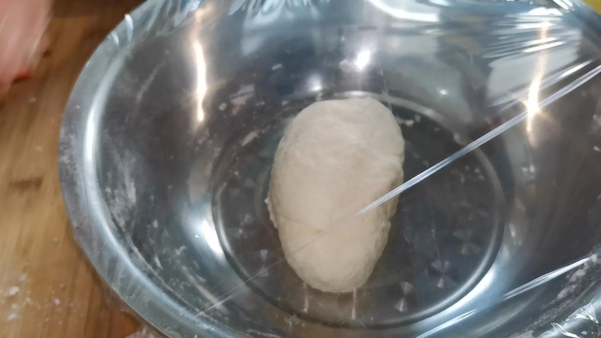 步骤1:高筋面粉中少加一点盐,增加面粉的筋性,用凉水和面,揉成光滑的面团,盖保鲜膜醒面,防止面团干皮子,醒面半小时,醒面同时,也要在把面团揉几次。