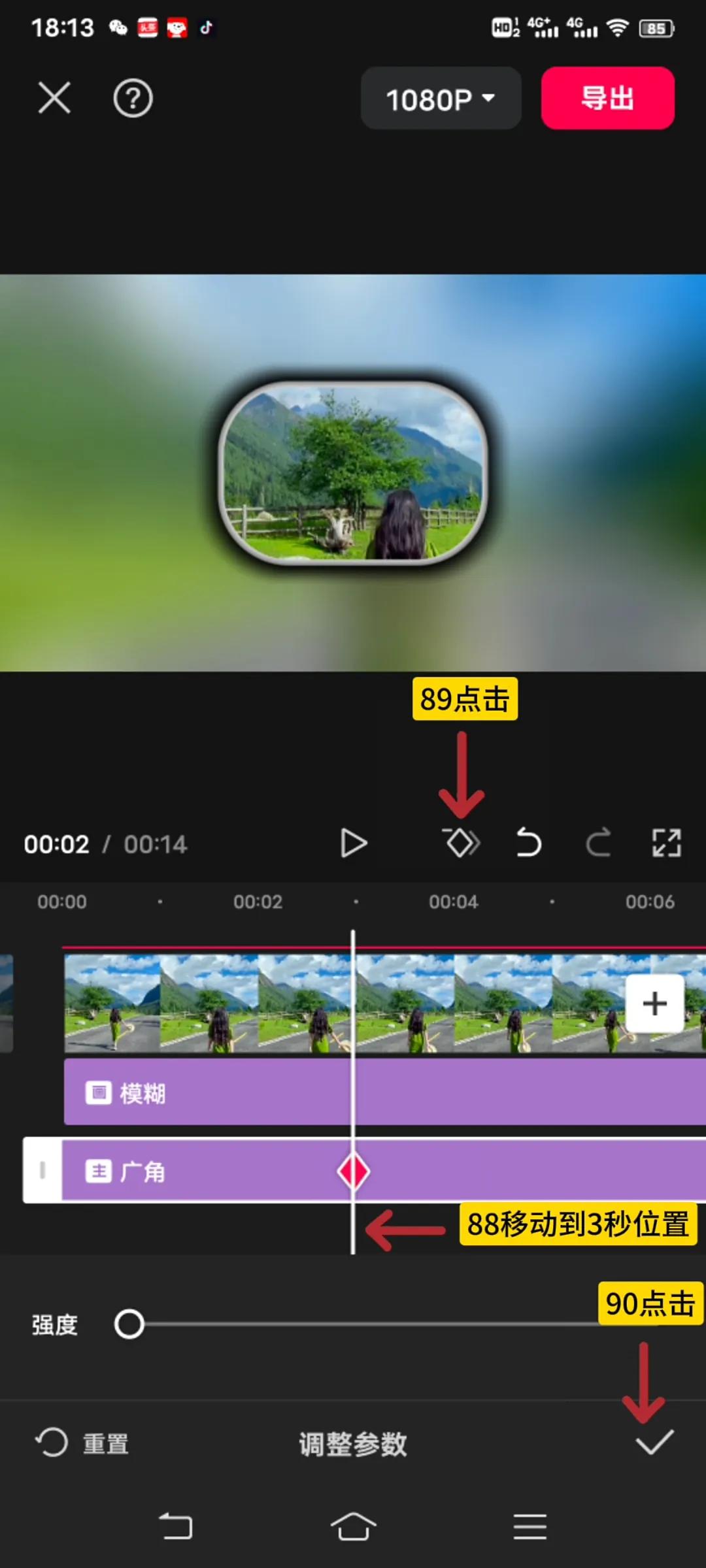 接着时间轴移动到3秒钟的位置,点击“关键帧”按钮,给广角添加一个关键帧,然后点击对✓,如图45-90所示。