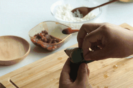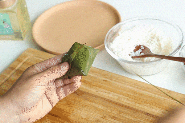 ③把粽叶叠成一个漏斗形,放入糯米、一颗红枣,压实,注意不要露馅,用扎绳绑住;