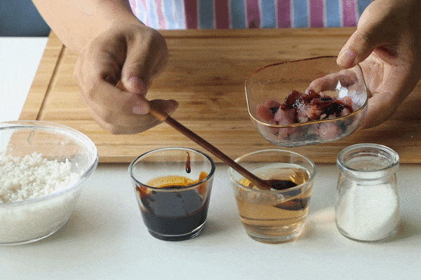 ②猪肉切成3cm小丁,与酱油、料酒、味精混合拌匀,浸泡一夜;
