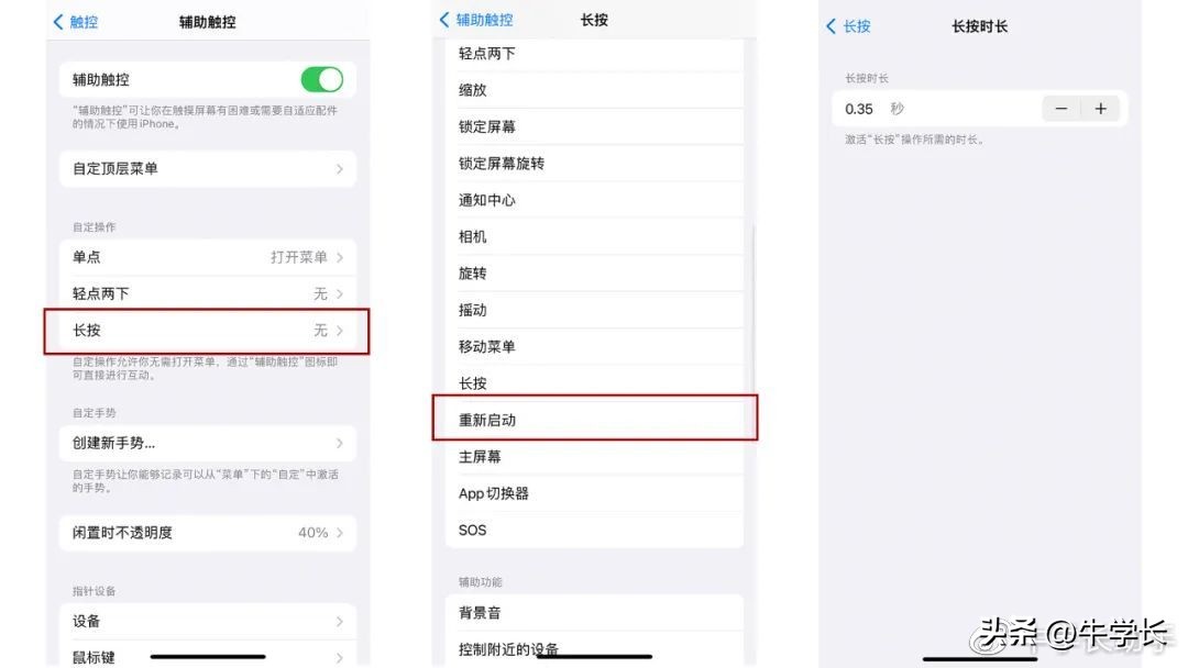 如将长按小白点设置为关机重启操作,只需点击“长按”,勾选“重新启动”,为了避免误触碰跳出的关机提示,还可以设置长按时长。