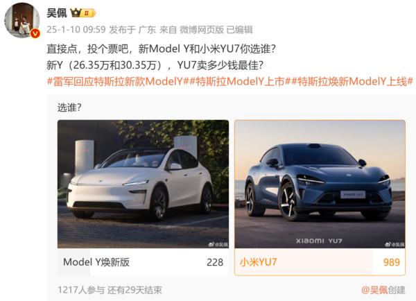 特斯拉新Model Y和小米YU7你选谁?超千人投票 结果一边倒