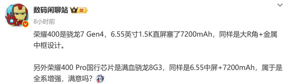 首发高通4nm芯片+7200mAh!荣耀400系列国行版配置出炉,全面增强