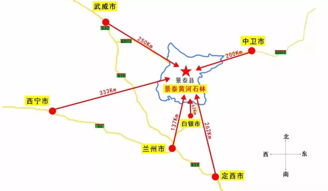 从兰州北上连霍高速,到忠和枢纽换京藏高速,在白银市出高速后沿省道201线行驶,到达景泰县中泉镇龙湾村,行程1小时。