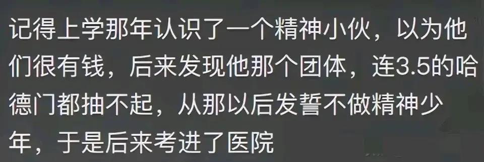 九十年代认识这类人群,穷是真的穷,天天捡烟屁股抽,但是真的很讲义气,天天压马路,天天蹲石墩子,实在受不了不跟他们玩了。