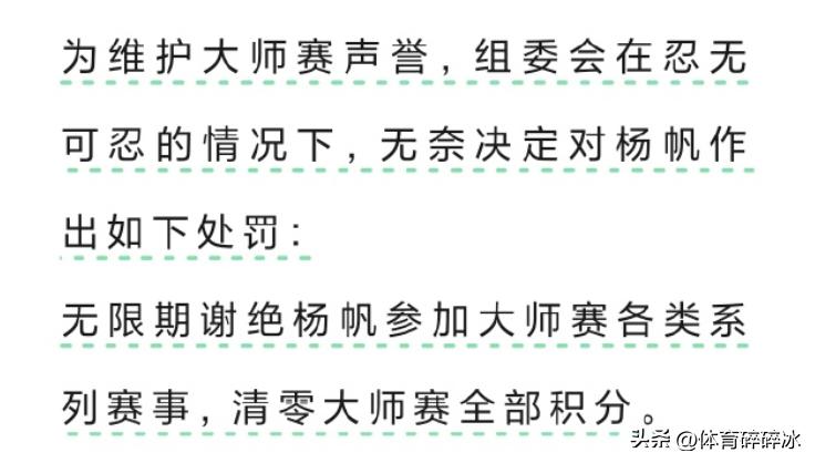 然后,就是处罚了,首先就是无限期禁止杨帆参加大师赛,还有就是之前的积分全部清零。
