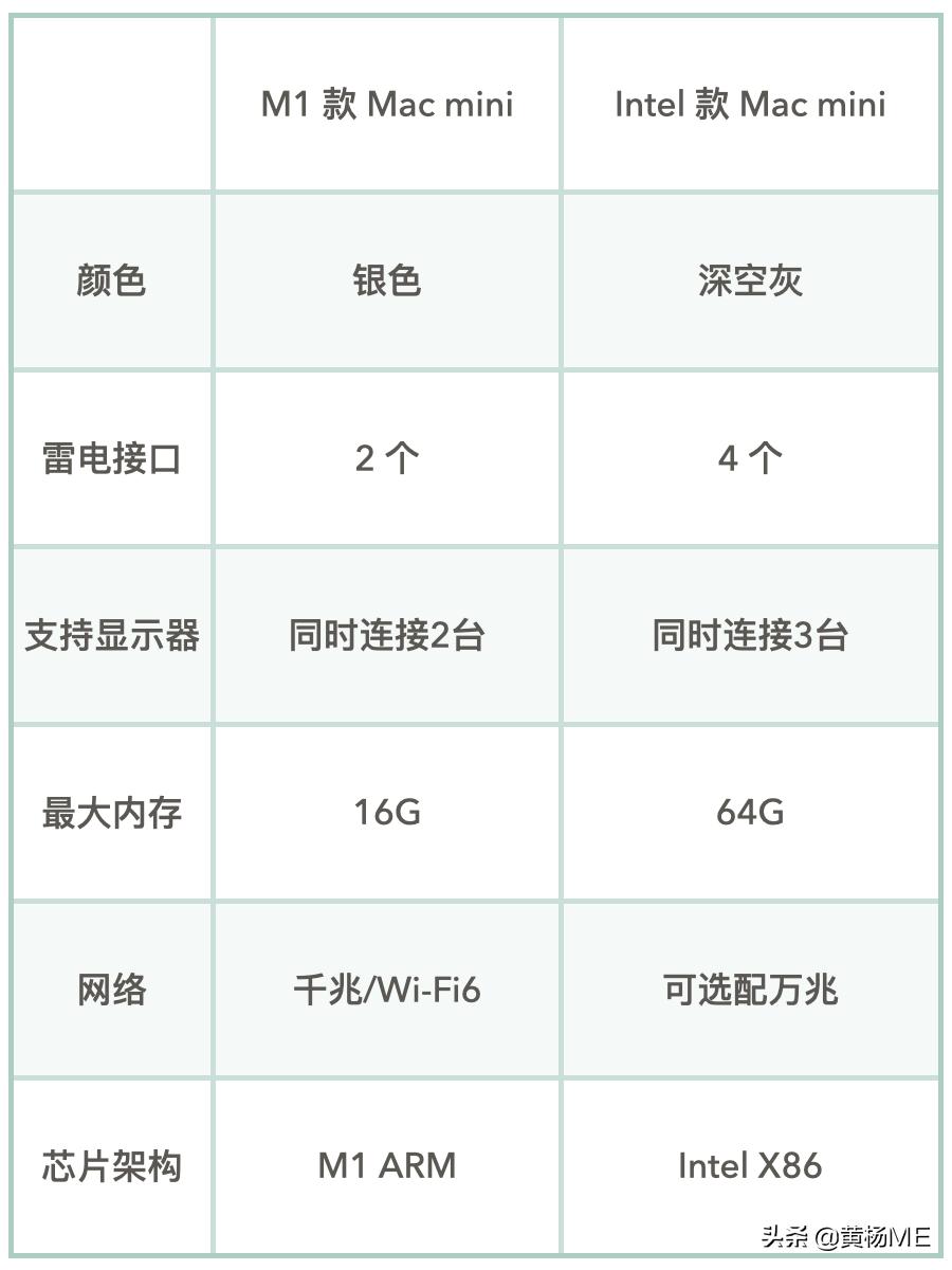 先来对比一下 M1 款跟前代 Intel 款有哪些变化。我做了个表格。