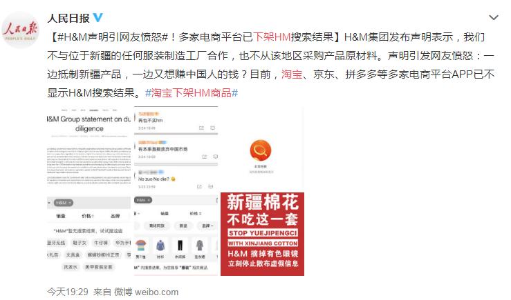 H&M操弄政治议题,停用新疆棉花引发众怒。身为知名企业,尊重事实是基本的商业准则,岂可混淆视听?身为跨国企业,更应尊重消费者,一旦伤害消费者必然被消费者所抛弃。中国的新疆棉花洁白无瑕,不容泼脏水,也不容污名化。中国市场虽大,但不欢迎任何恶意中伤者! 央视新闻评论:中国事务岂容说三道四?