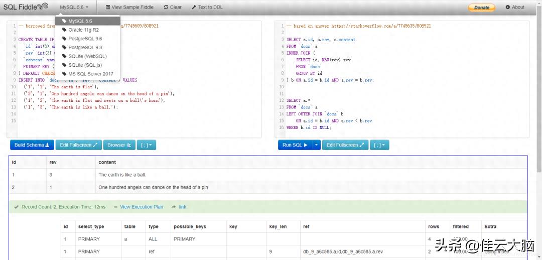 这个网站应该是目前支持数据库种类最多的在线环境,而且每种数据库还提供了不同的版本。如果你点击“compare”,可以同时在两个不同的数据库中运行测试,比较它们的结果。