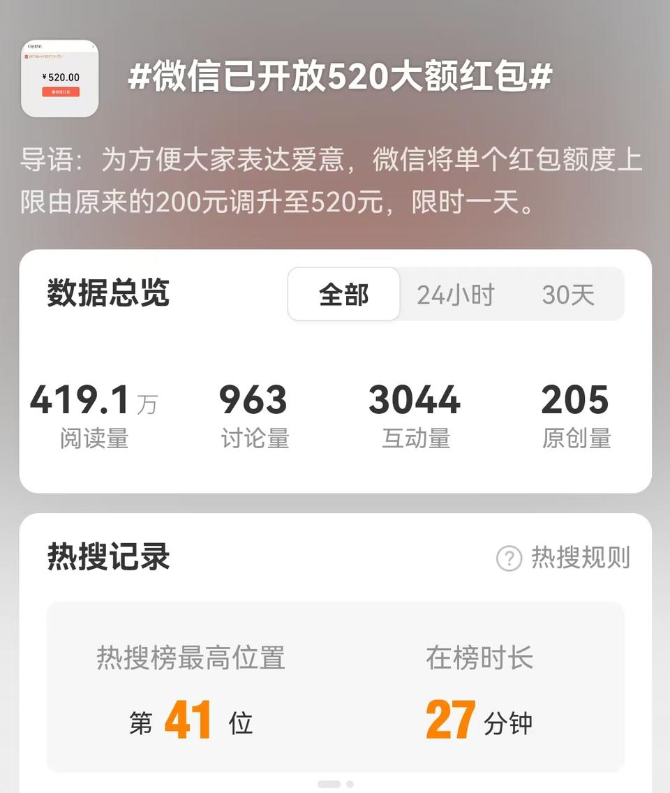 今天零点一过,微信 520 限定红包也回归上线,微信红包额度从日常的 200 元,调整为 520 元,仅限今日。