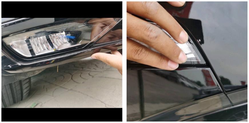 两个前大灯日期都在出厂之前,肯定没换过,但是左前大灯跟前杠的交界处明显有裂纹,之前应该有小的剐蹭,导致大灯破损了;再往前看,前保险杠有很明显的喷漆痕迹,同时还有掉漆,不过这都不是啥大问题了,6年的车了易损件的修复再正常不过了。