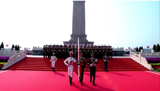 伴随着轰鸣的礼炮声,222名国旗护卫队员从人民英雄纪念碑北侧平台走下,阔步走向国旗基座。