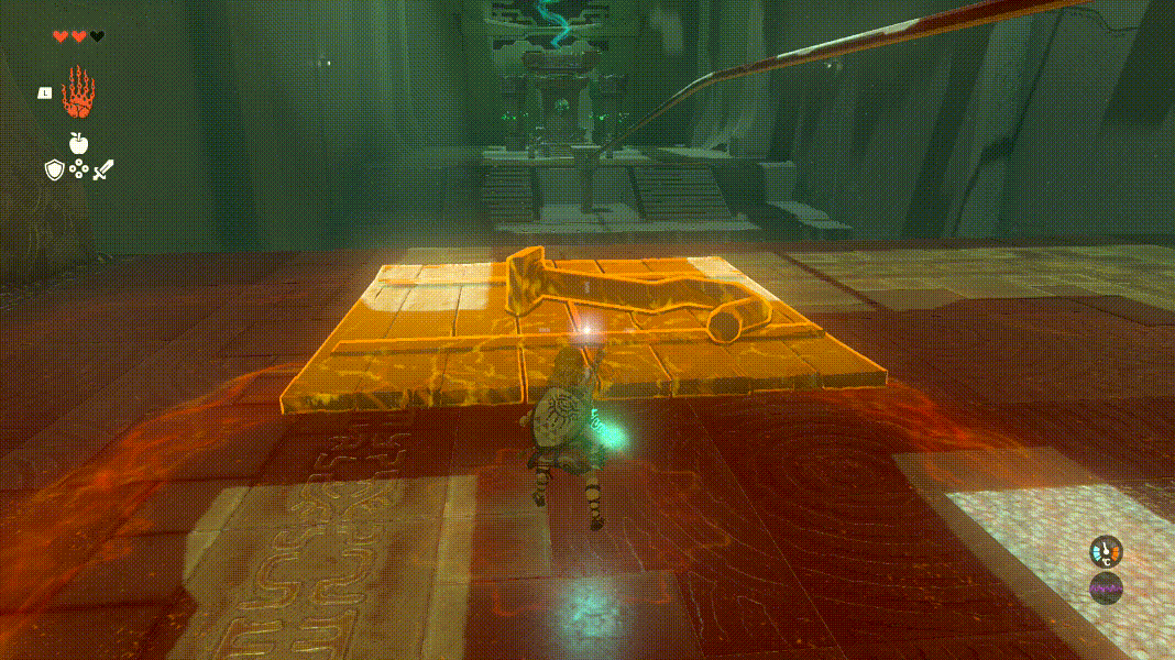 在乌可乌候神庙内,玩家会解锁第一个能力“究极手”。装配两个木板,增加长度,协助我们抵达对岸。在这之后,右边角落的柱子上有一个宝箱,用刚刚的木板搭起斜坡就能抵达上方。另外,还可以利用两块木板垫脚,用究极手将宝箱抓下。