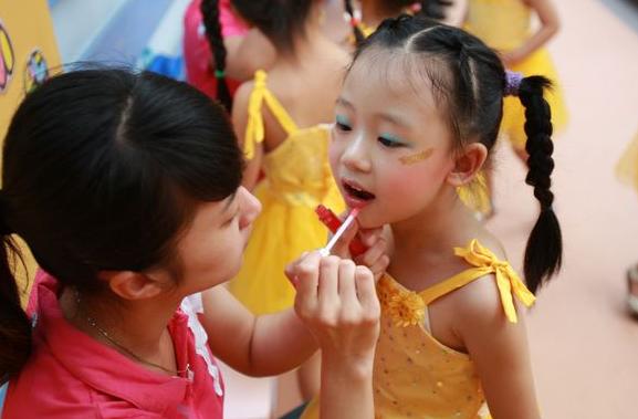 孩子的唇色选用的颜色需要明亮、鲜艳的,在灯光下才能显现出来,也更能衬托孩子的肤色、活力的气息。唇的轮廓不宜太大。可以用唇笔给孩子涂一层唇膏,要薄一些,不然孩子的嘴巴就会嘟着,涂完唇膏,孩子的嘴上会感觉少一些亮光,需要在用唇彩涂抹一层,这时候可以选择浅色或者无色的都可以,增加嘴唇的颜色。(为了上场的效果,又在离上场还有很长一段时间,可以到临场的时候再涂,不然可就给孩子都吃光光了)