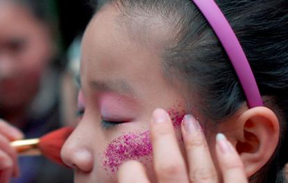 眼影的颜色根据服装的整体颜色搭配,例如:粉色的服饰可以用粉色、紫色。儿童的眼影妆容都是以体现活泼俏皮的颜色为主,避免使用暗色眼影,如烟熏。幼儿的眼影可以适当的夸张,在涂眼影前,可以先打一层高光,在眼睑上,也可以在眼角附近。