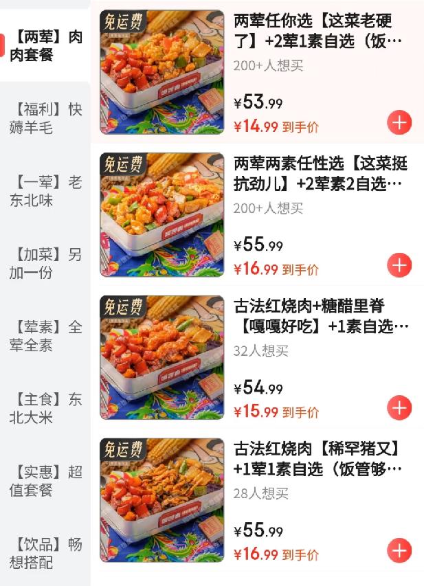 在几乎人手都有的“15-10”和“8-7”免费红包与百亿补贴券的加持之下,消费者几乎可以在所有的外卖商家店中买到“拼好饭”价格的正餐,过去只能在美团拼好饭和饿了么拼团频道点点的15元外卖,现在在京东上却有了更多的选择。