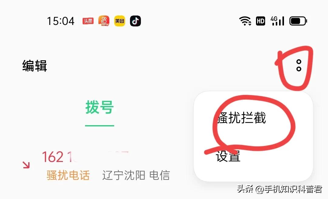 点通话记录右上角的两小点,再选择骚扰拦截(如上图所示)