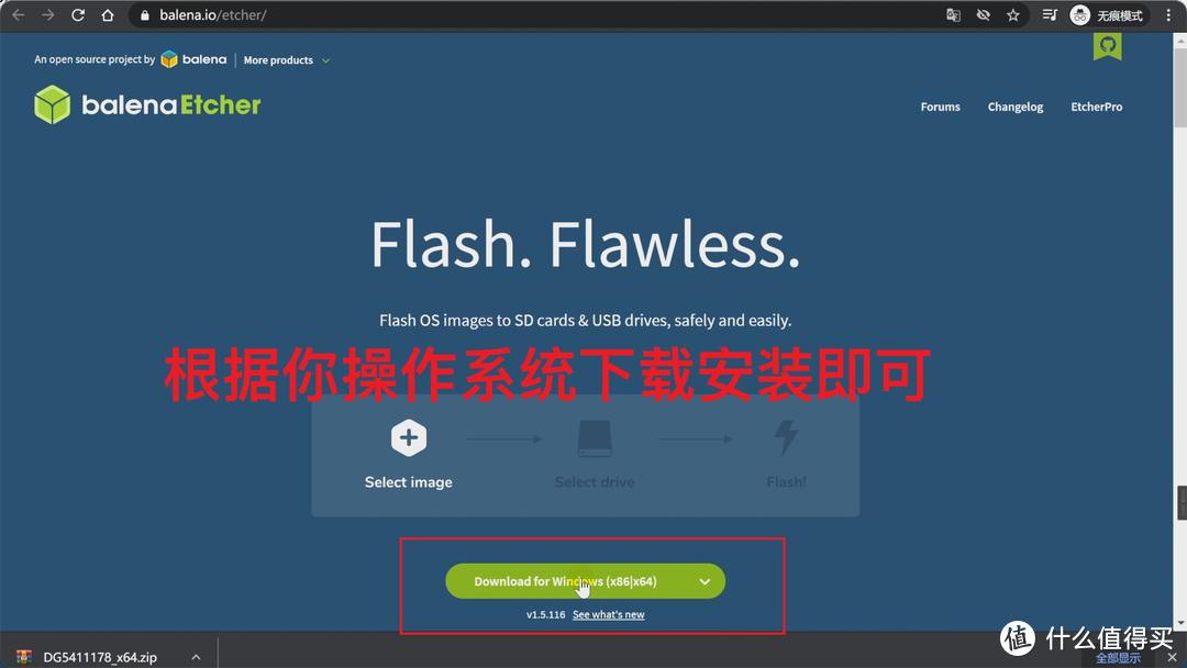 下载并解压固件后,我们下一步就是把解压后的固件写入U盘中,所以还需要一个U盘写盘工具,使用的是这个etcher的写盘工具,非常好用,可以把软路由镜像写入U盘中,下载这个写盘工具,etcher官网直达