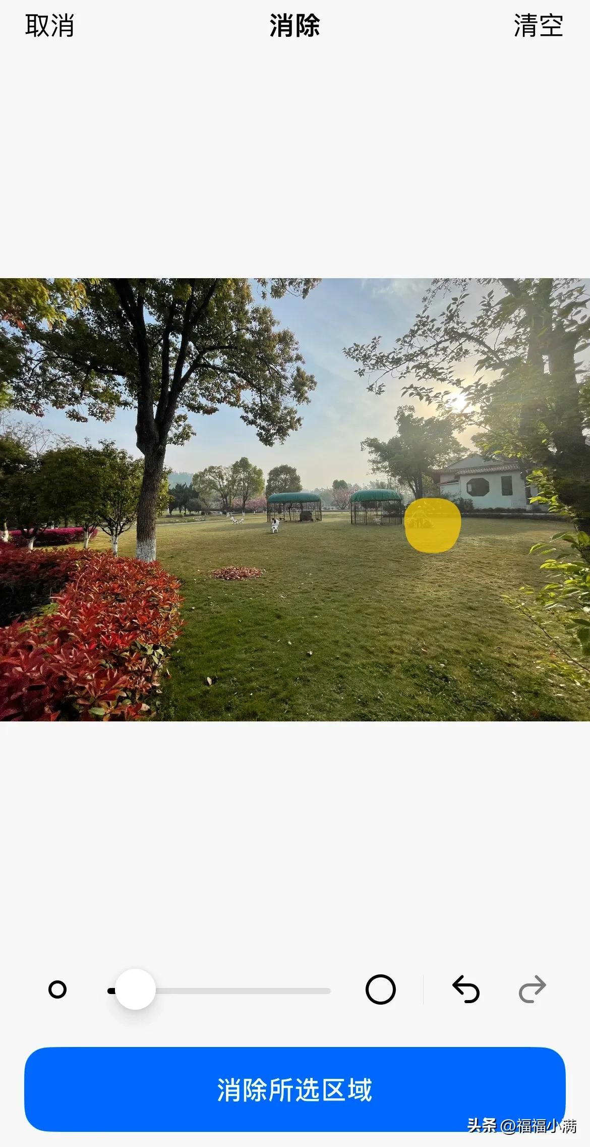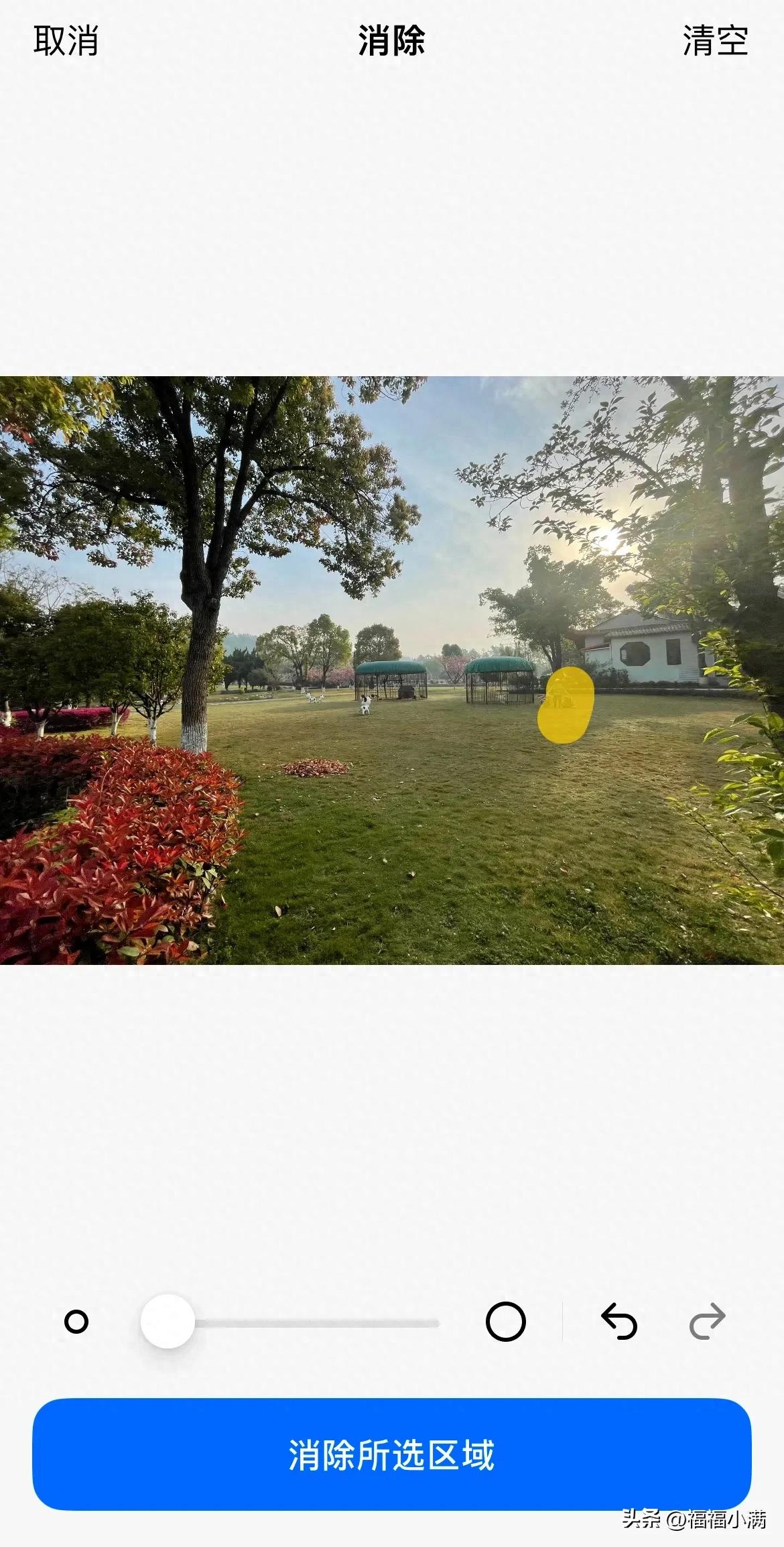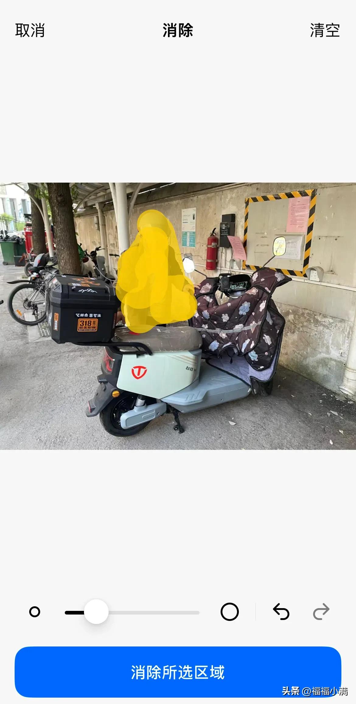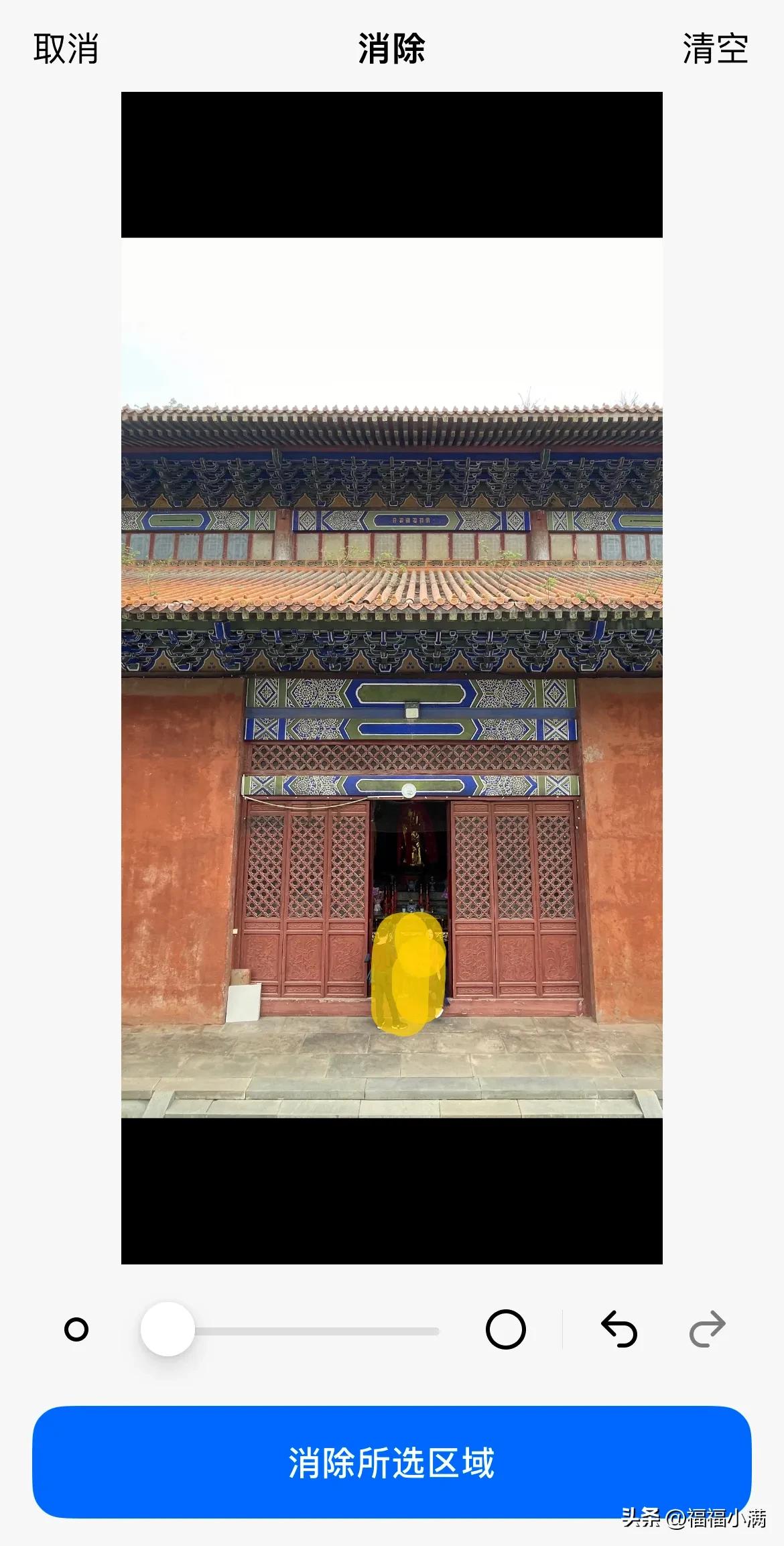 根据照片路人的大小,调整笔的大小,对路人进行涂抹,涂抹的地方就用黄色标识出来,最后就是点最下方蓝色按钮“消除所选区域”就好了!